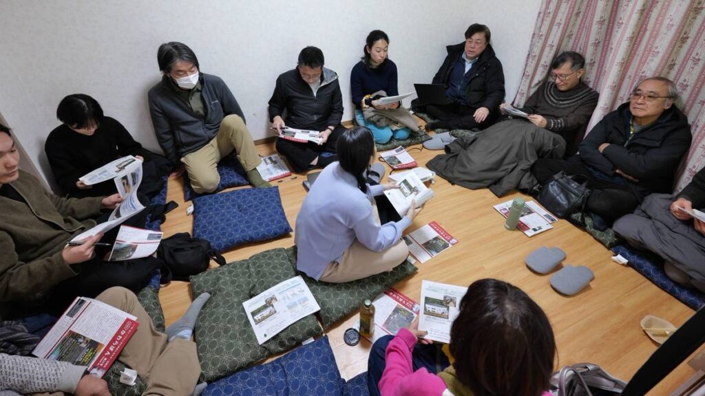 当日はあいにくの降雪・積雪をものともせず、世代を超えて10数人の会員が集合。まずは、森のエネルギー研究所の菅野明芳さんから身近な森林資源活用による木質バイオマス事業などについてレクチャーを受けました。さらに、ニュージーランドの自然の中で暮らす人たちとのホームスティ体験の報告。その後、「おらってハウス」でやりたいことについて、グループに分かれてブレーンストーミング形式で話し合いました。